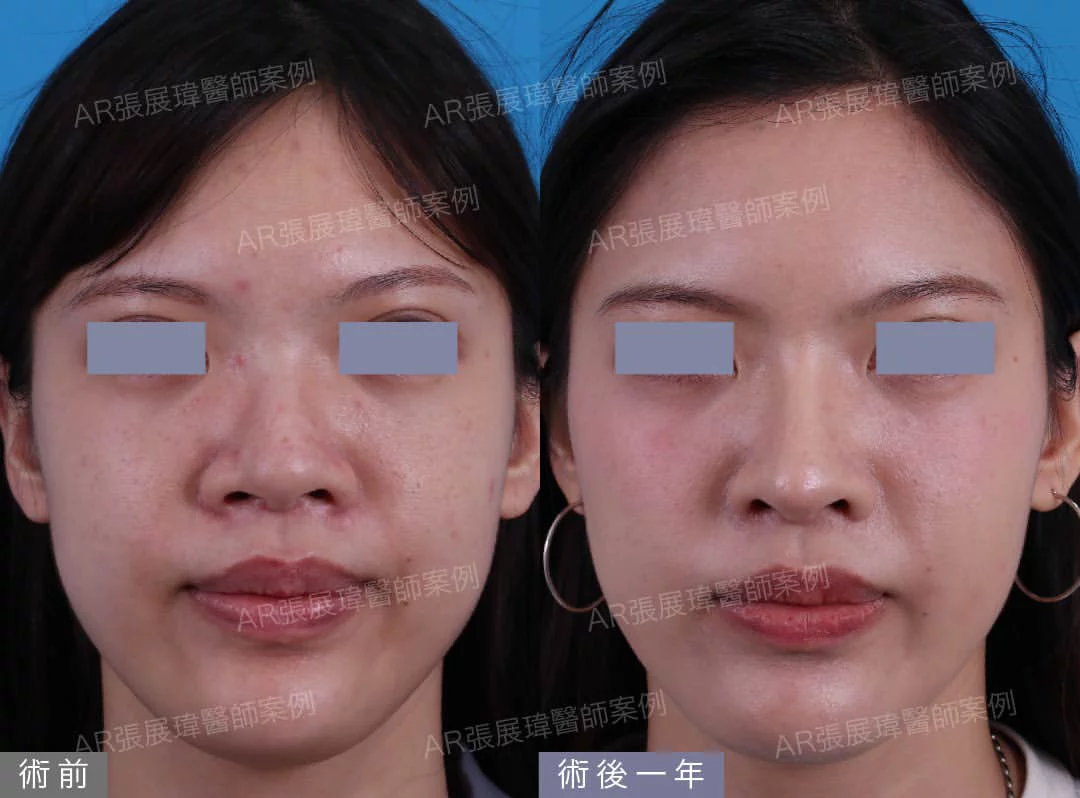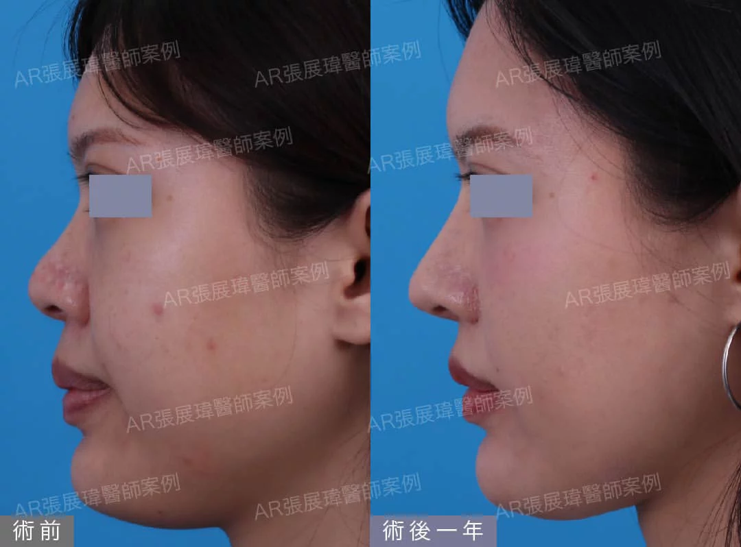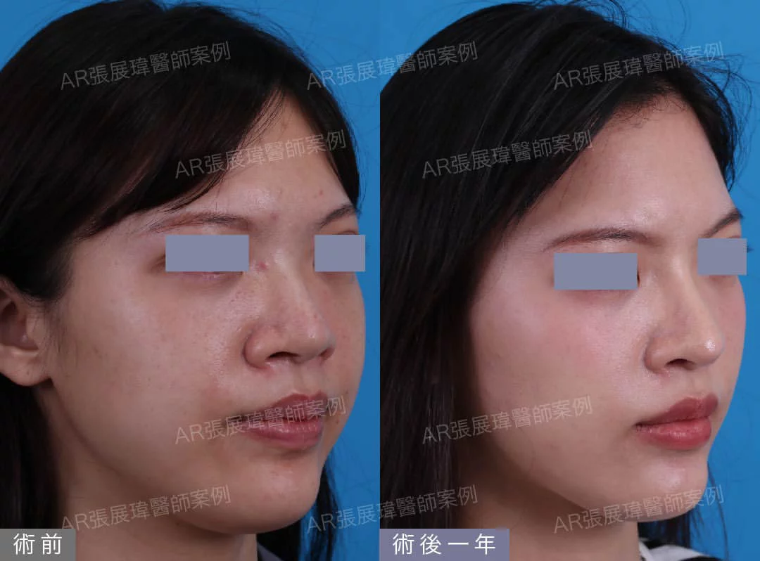 患者術前鼻型為短鼻、蒜頭鼻及寬鼻翼。張展偉院長為客人進行半自肋結構式隆鼻+敲鼻骨+縮鼻翼,改善過寬的鼻翼及鼻孔形狀,塑造自然的眉心山根曲線及精緻化鼻頭。