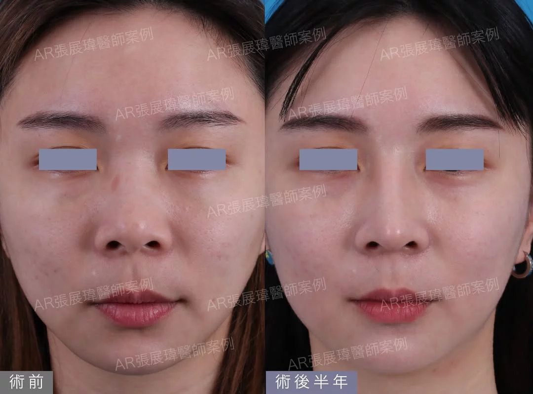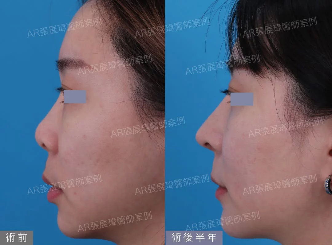 患者術前鼻型為短鼻、朝天鼻、山根低平、鼻樑較寬。張展瑋院長為其客人進行半自肋結構式隆鼻+敲鼻骨,塑造挺而自然的山根曲線,得到氣質高雅的鼻型。