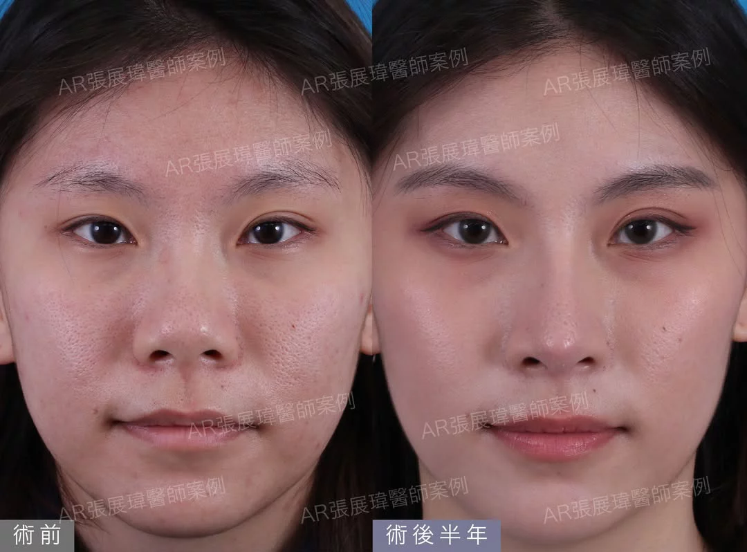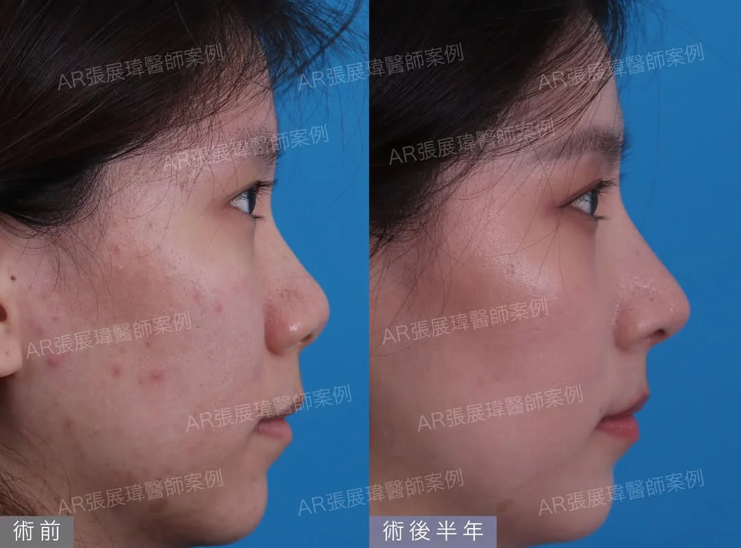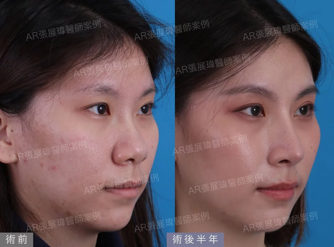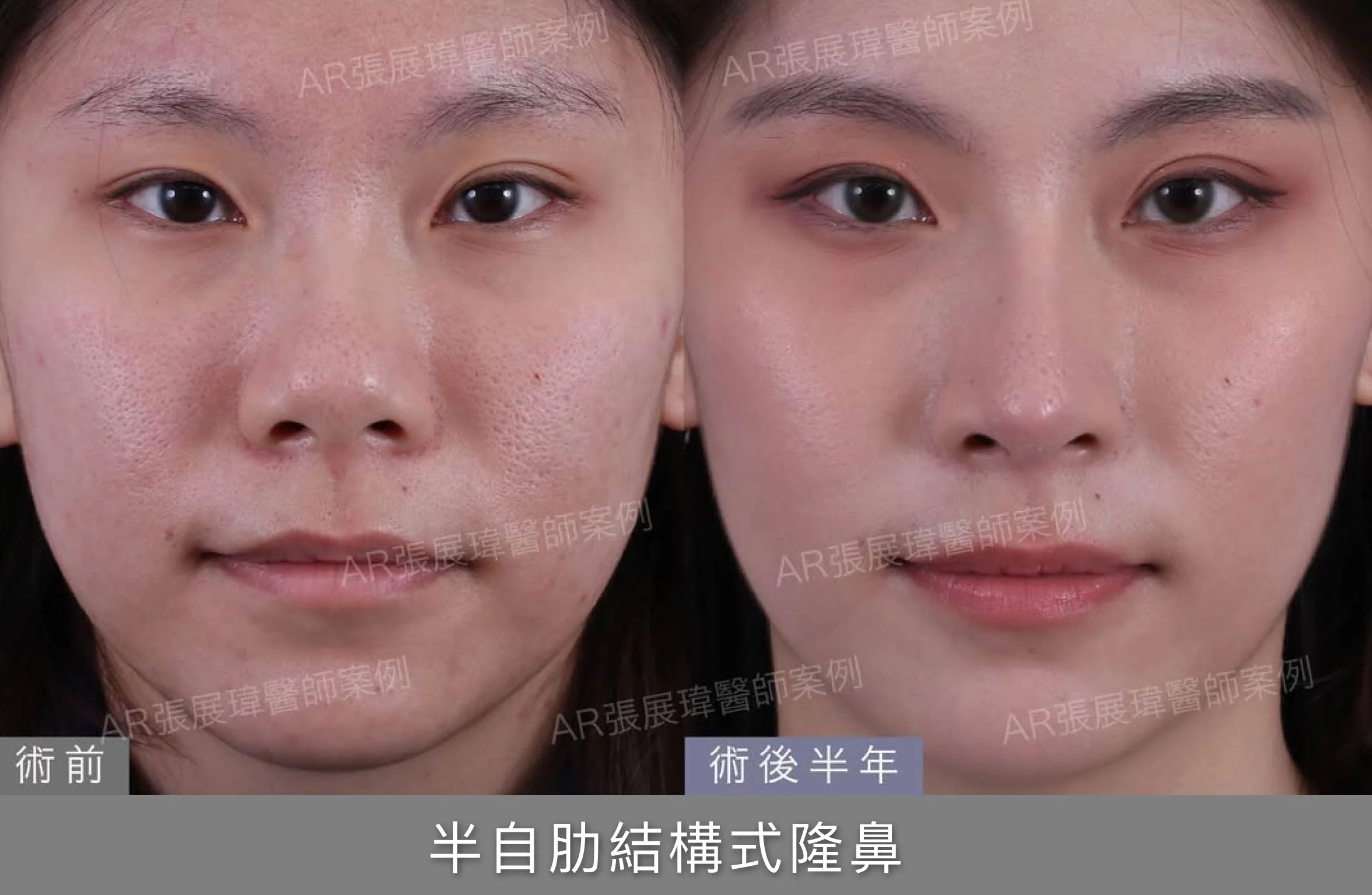 患者術前鼻型為蒜頭鼻及朝天鼻、山根較低、鼻翼較為肥厚。張展瑋院長為客人進行半自肋結構式隆鼻,改善蒜頭鼻及朝天鼻,塑造精緻的山根與鼻尖曲線,呈現自然與秀氣的美。