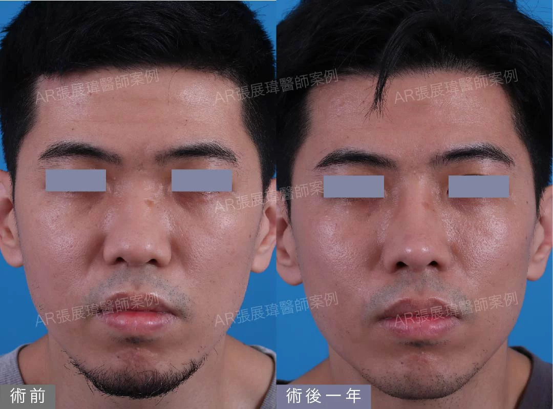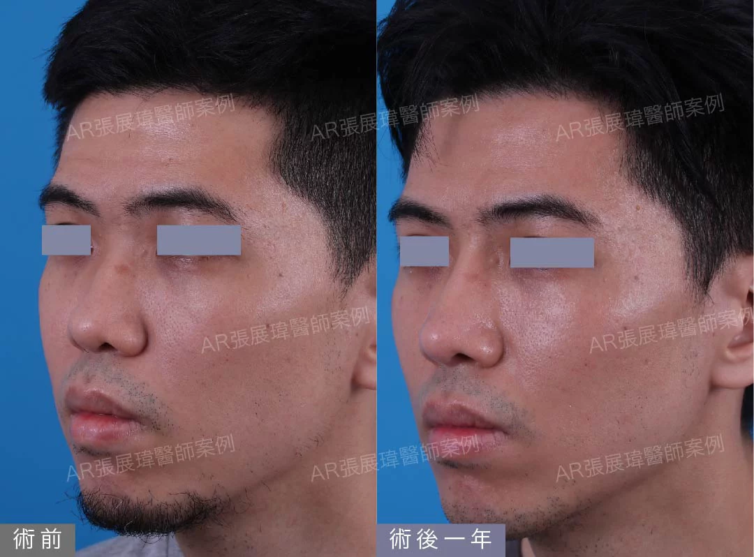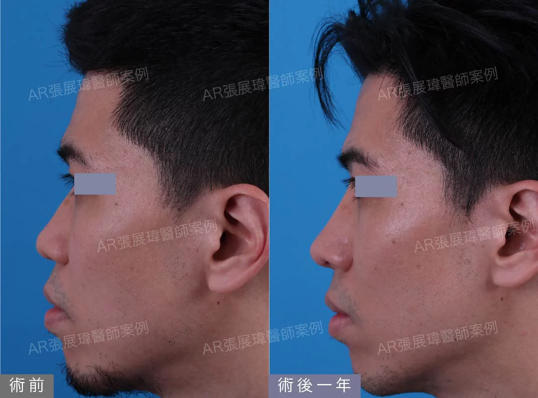 本案例為塌鼻及蒜頭鼻,張展瑋院長針對客人進行半自肋結構式隆鼻手術+墊眉心。術後一年追蹤鼻型為自然高挺的鼻樑及精緻鼻頭;短鼻蒜頭鼻及嘴凸獲得改善。