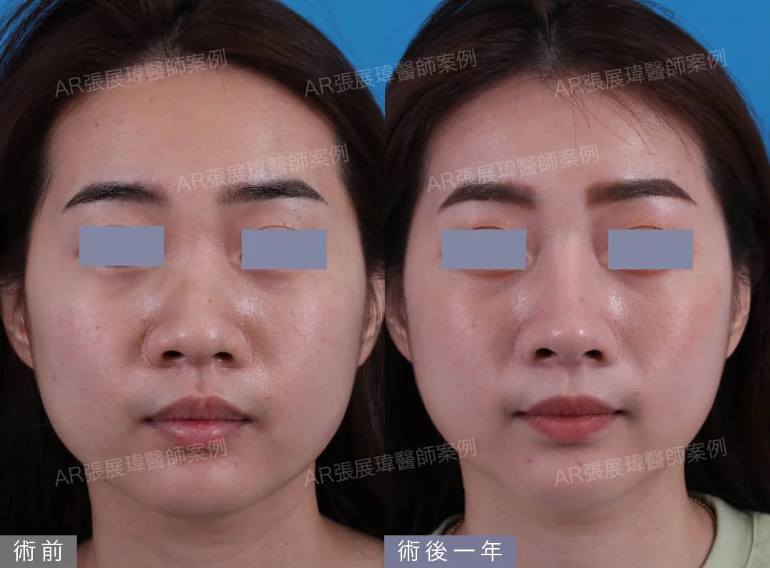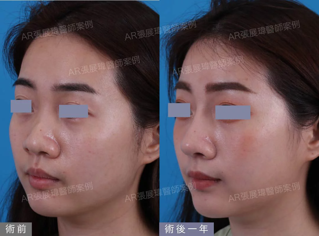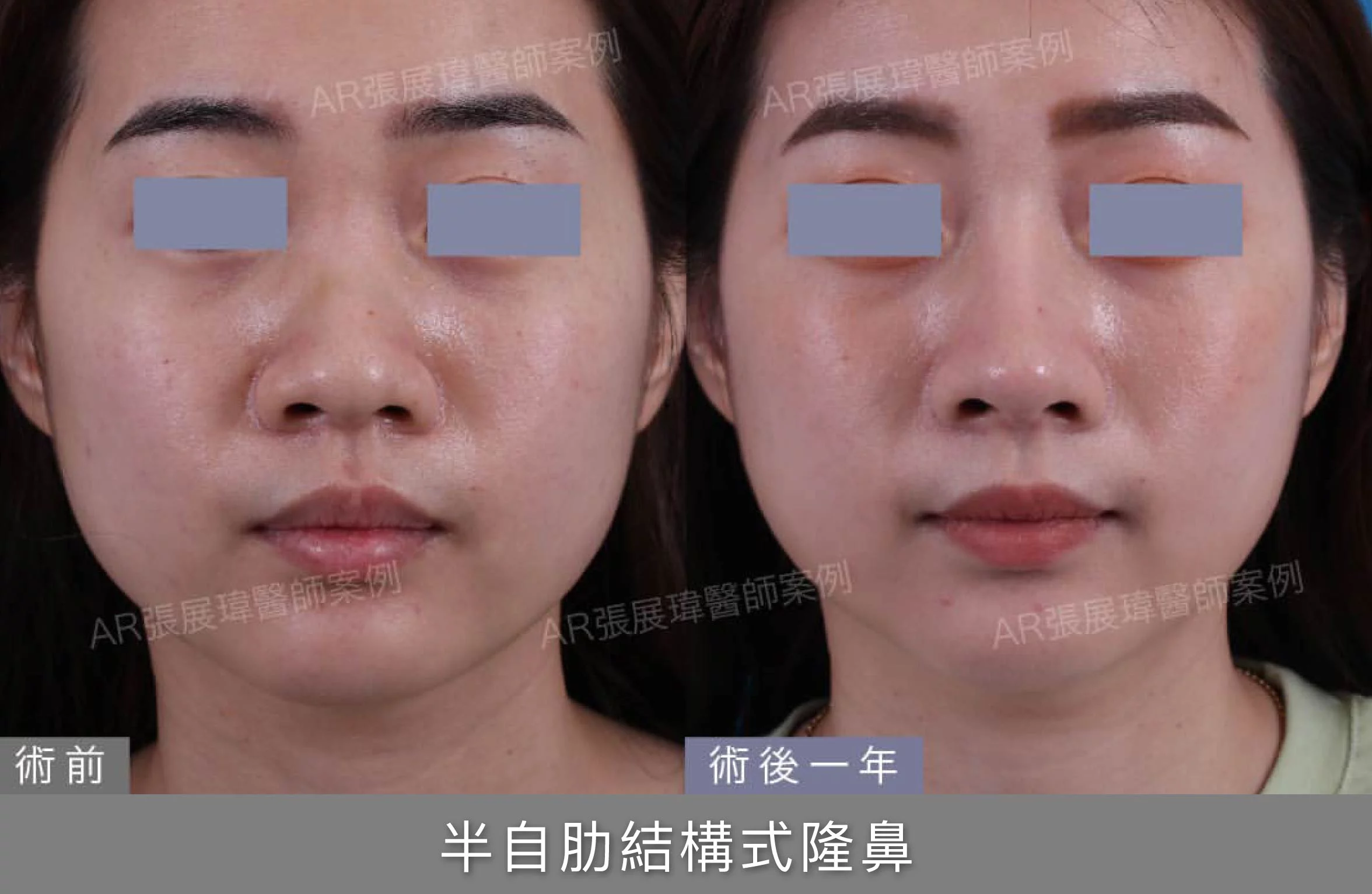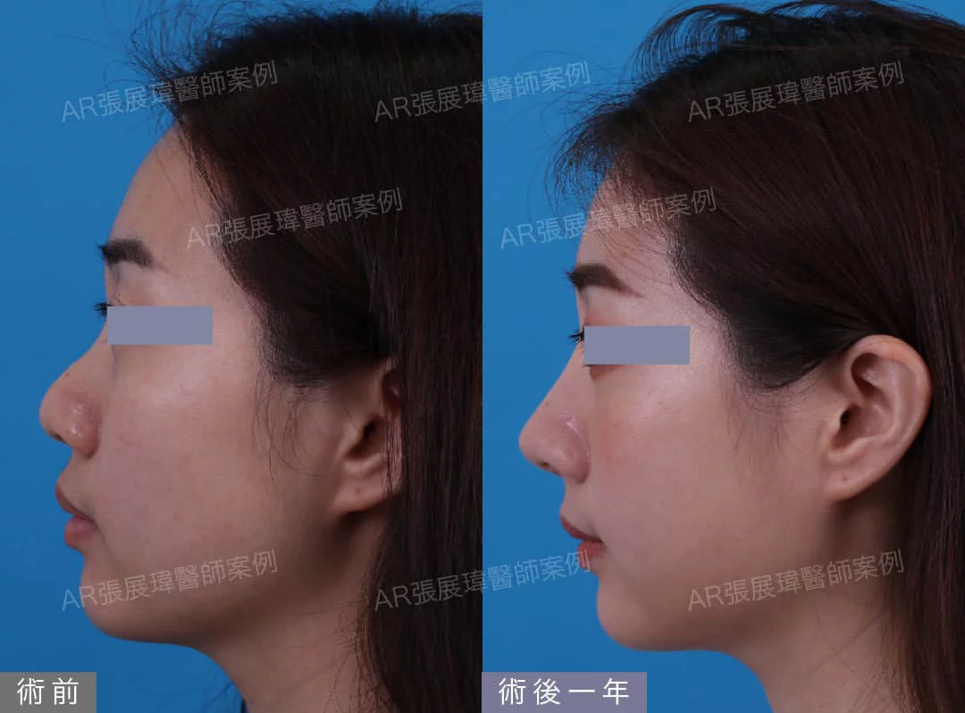 患者術前為蒜頭鼻及短鼻,張展瑋院長為客人進行半自肋結構式隆鼻,術後一年鼻型為立體自然的鼻樑、精緻的鼻尖與呈現海鷗線外觀的鼻孔。