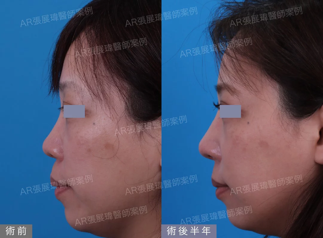 患者術前鼻型為短鼻及山根低。張展瑋院長為其客人進行全自肋結構式隆鼻,進行短鼻延長,塑造自然的鼻型。