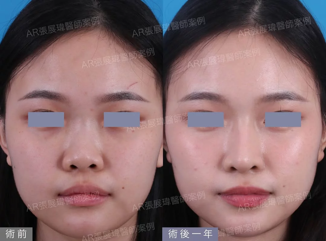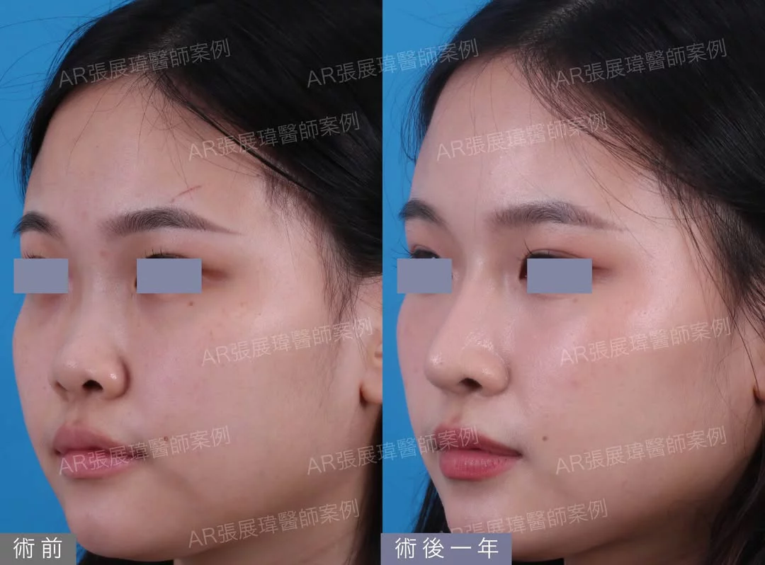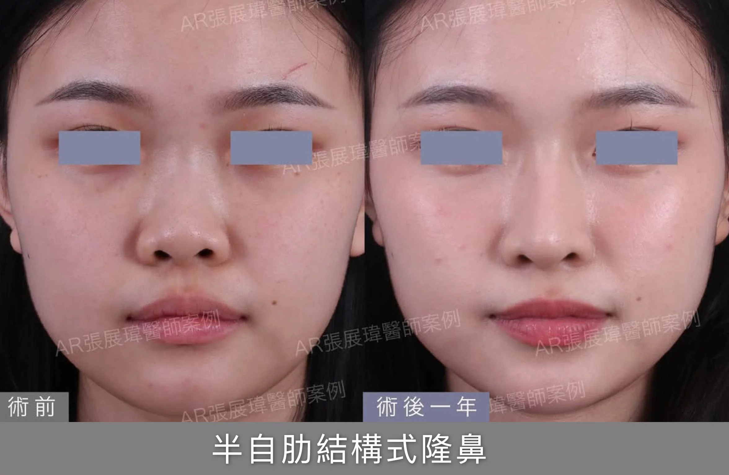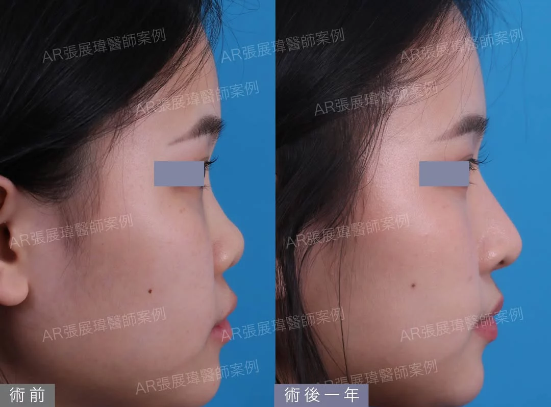 患者術前鼻型為短鼻、朝天鼻、鼻樑低平,顯得中臉凹陷。張展瑋院長為其客人進行半自肋結構式隆鼻,塑造自然的鼻樑山根曲線,改善整體比例。