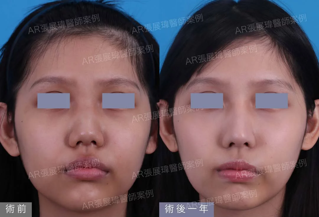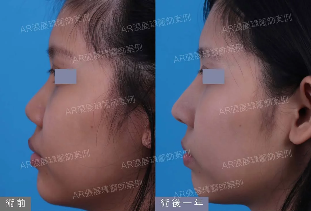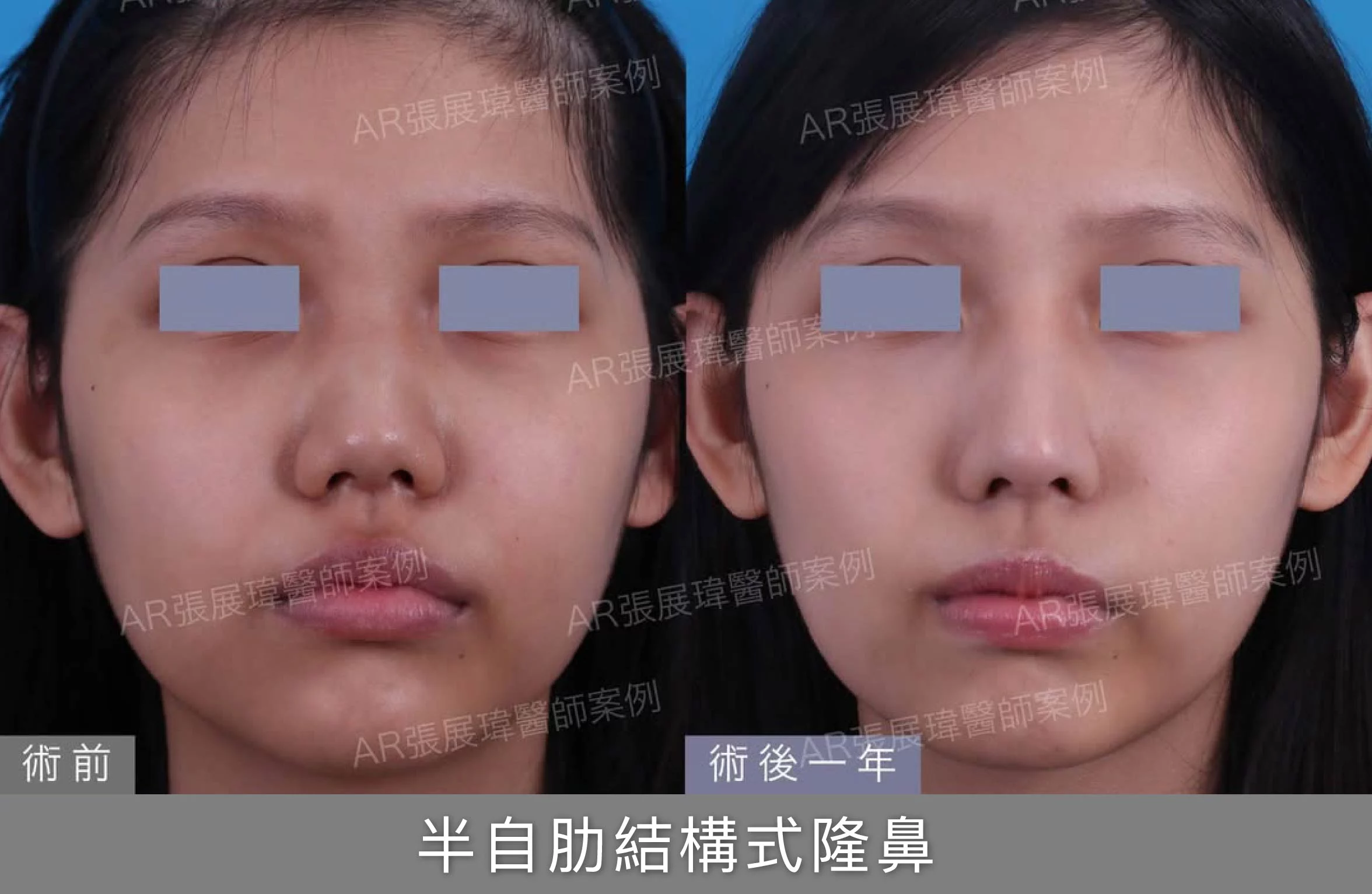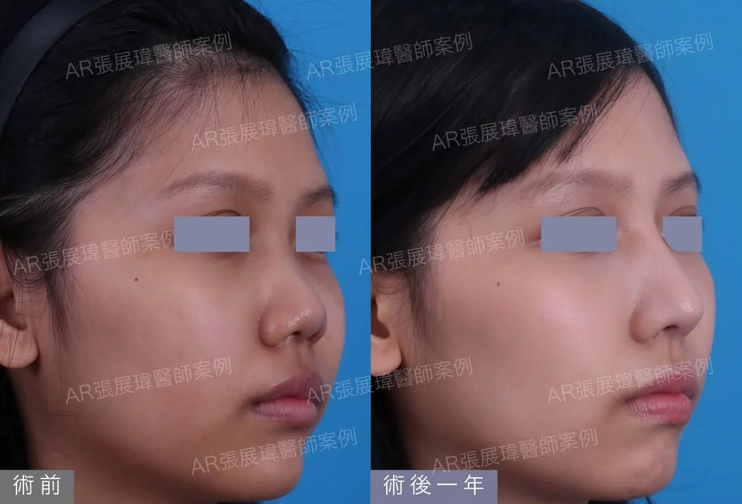 患者術前先天短鼻、塌鼻及鼻小柱後縮。張展瑋院長以半自肋結構式隆鼻手術為其客人改善短鼻,得到符合五官比例的精緻鼻型。